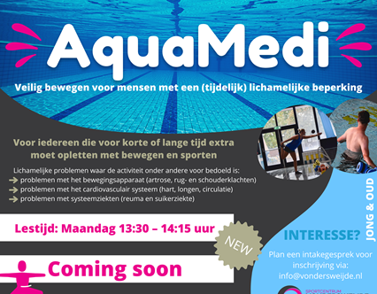AquaMedi is een besloten groep voor mensen met een beperking en/of lichamelijke klachten. Hierbij kan gedacht worden aan o.a. artrose, neurologische aandoening (CVA/ beroerte, parkinson) chronische pijn, long-covid, MS, reuma, obesitas en diabetes. Deze doelgroep heeft vaak moeite en/of angst bij het bewegen.