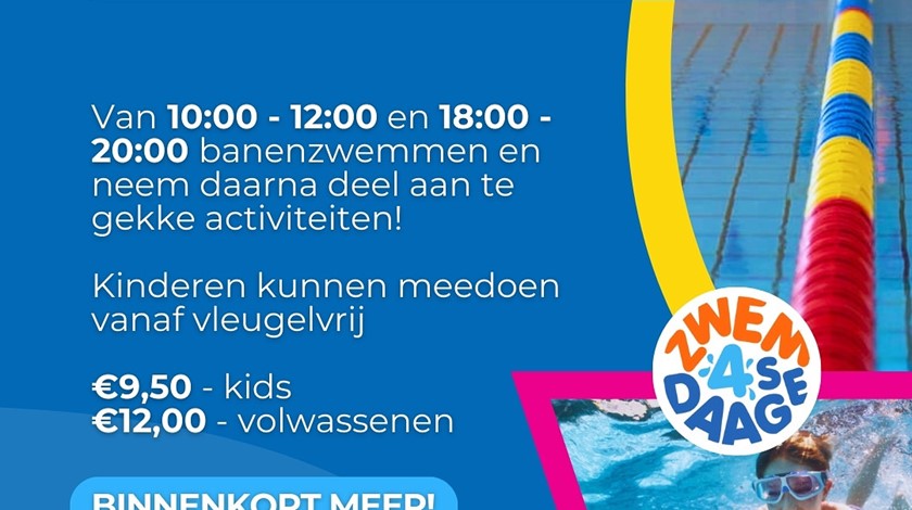 De zwemvierdaagse bij Vondersweijde komt eraan ! Samen met OZ&PC organiseren we dit gezellige zwemevenement met elke dag baantjes zwemmen en superleuke activiteiten.